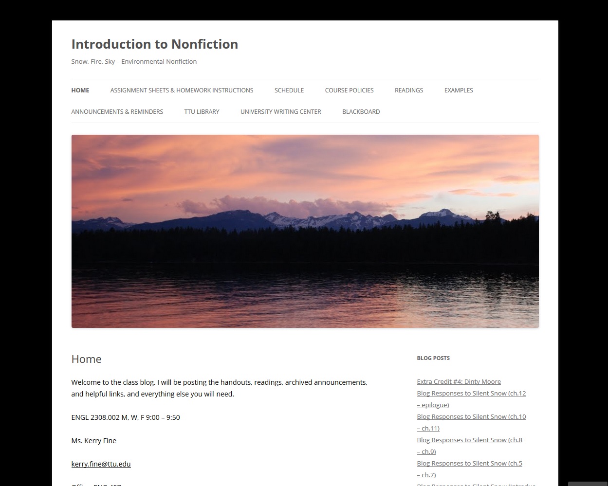 ENGL 2308: Introduction to Nonfiction – Snow, Fire, Sky – Environmental Nonfiction, Fall 2012. Texas Tech University.
